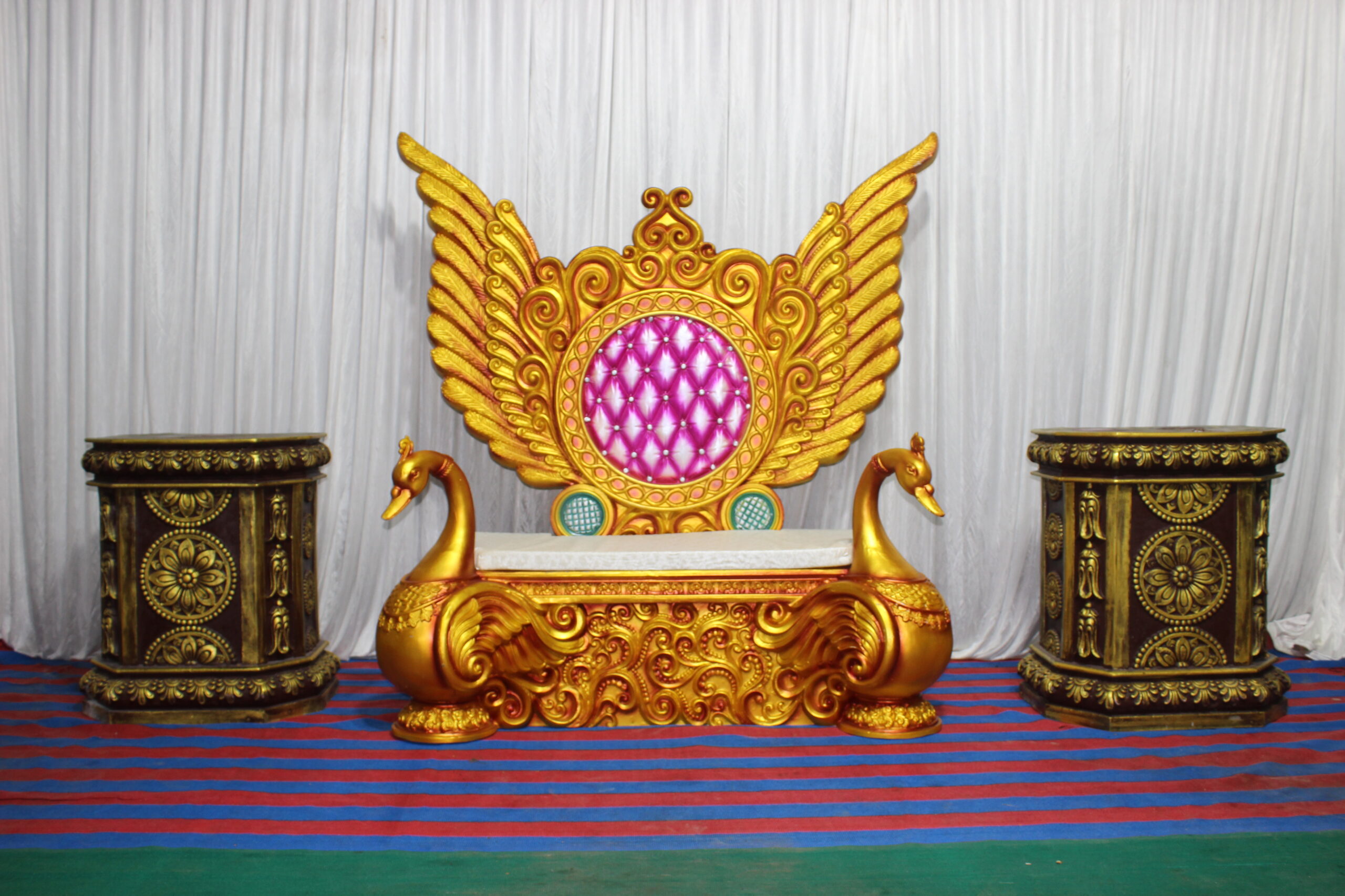 South Indian style fiber sofa with peacock back design. Available in gold, multi-color and silver.