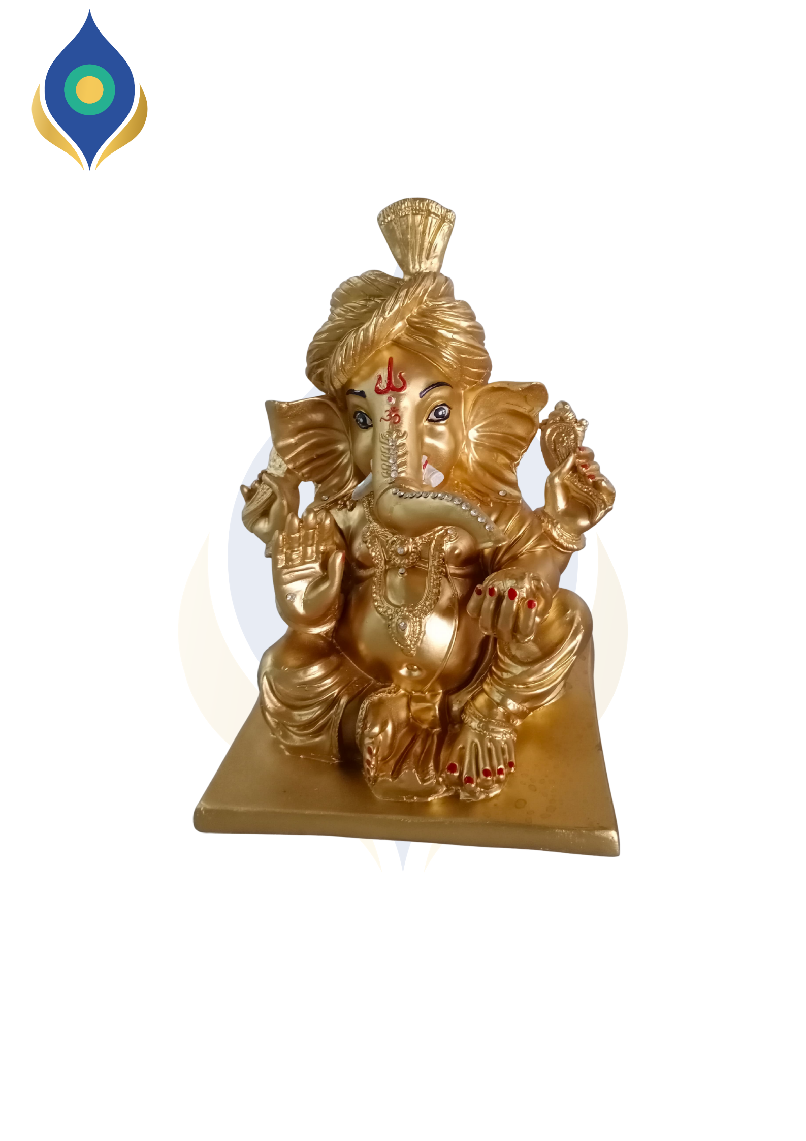 Small Feta Ganesha fiber idol, 15 inches in gold. Ideal for small mandap or table decor.